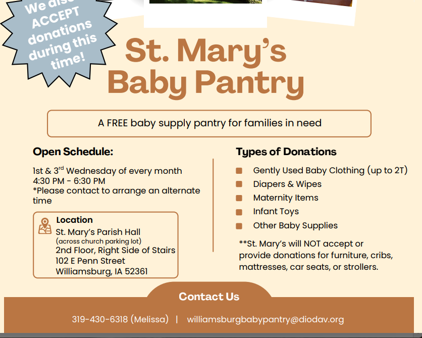 St. Mary's Baby Pantry-Iowa County Articles in this section St. Mary's Baby Pantry-Iowa County Social Security Office-Iowa County The Attic-Free Clothes-Iowa County Iowa County Resource Directory General Assistance-Iowa County Public Health Department-Iowa County
